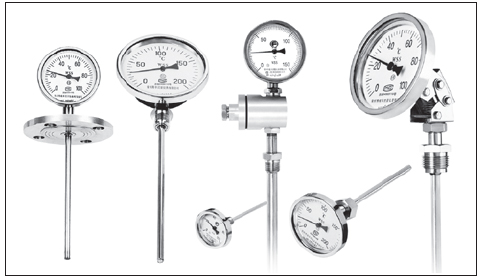 測(cè)量氣體和液體的溫度。與玻璃溫度計(jì)相比,它具有無(wú)汞損壞、讀數(shù)清晰、堅(jiān)固耐用的優(yōu)點(diǎn)。我生產(chǎn)多用途雙金屬溫度計(jì),規(guī)格品種齊全,質(zhì)量穩(wěn)定可靠,可廣泛應(yīng)用于工業(yè)、農(nóng)業(yè)、國(guó)防和科研領(lǐng)域的各個(gè)部門(mén)。雙金屬溫度計(jì)結(jié)構(gòu)特點(diǎn)和工作原理雙金屬 溫度計(jì)(以下簡(jiǎn)稱(chēng)溫度計(jì))使用螺旋加熱器雙金屬板作為溫度傳感元件,并將其安裝在保護(hù)套中,一端固定(固定端),另一端(自由端)連接到薄軸上,軸端帶有指針。當(dāng)溫度變化時(shí),溫度傳感元件的自由端立即旋轉(zhuǎn),并通過(guò)細(xì)軸驅(qū)動(dòng)指針以指示刻度盤(pán)上的溫度變化。直行溫度計(jì)通過(guò)轉(zhuǎn)向傳動(dòng)機(jī)構(gòu)驅(qū)動(dòng)指針。外殼材料包括鋼板、鑄造鋁合金和不銹鋼板??烧{(diào)角度溫度計(jì)的頭部可借助波紋管、轉(zhuǎn)角機(jī)構(gòu)和其他部件從角度調(diào)整為直線或從直線調(diào)整為角度。